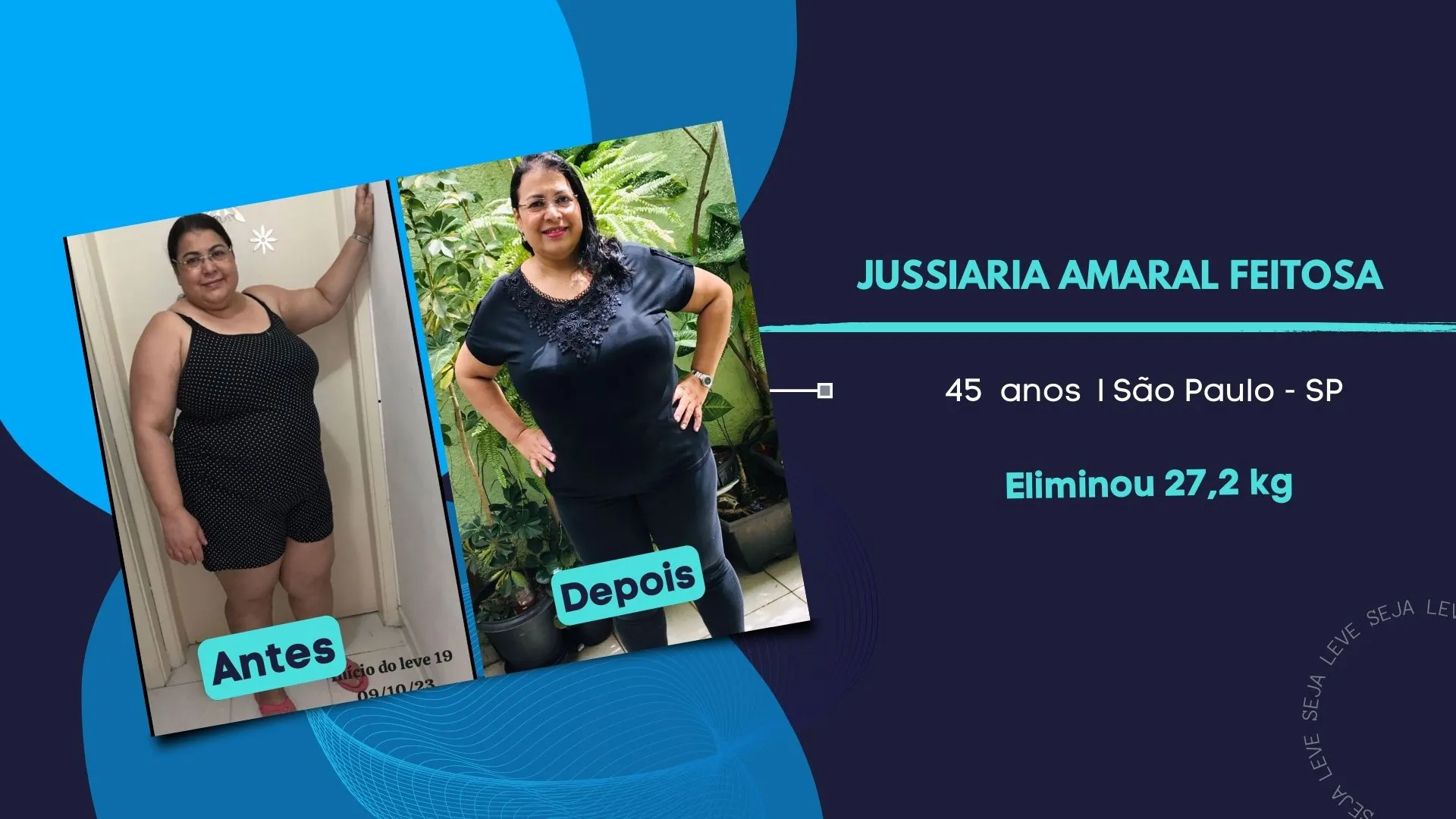 Hoje eliminei 27.200kg e 20cm de medida abdominal, estou muito feliz com meus resultados. Minha saúde melhorou muito, nem meu médico acreditou ao ver os resultados dos meus exames e pediu para repetir tudo novamente em outro laboratório que graças a Deus alguns até melhorou mais ainda. Estou muito satisfeita com a bagagem de conhecimento que carrego hoje. Obrigada Nutri e Dr Cristiano aprendi muito com vocês.
